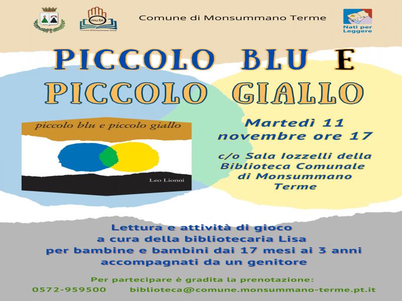 Martedì 11 novembre 2025, alle ore 17, nella Sala Iozzelli della Biblioteca "Giuseppe Giusti" di Monsummano Terme si terranno attività di lettura e di gioco dal titolo "PICCOLO BLU E PICCOLO GIALLO", a cura della bibliotecaria Lisa.
