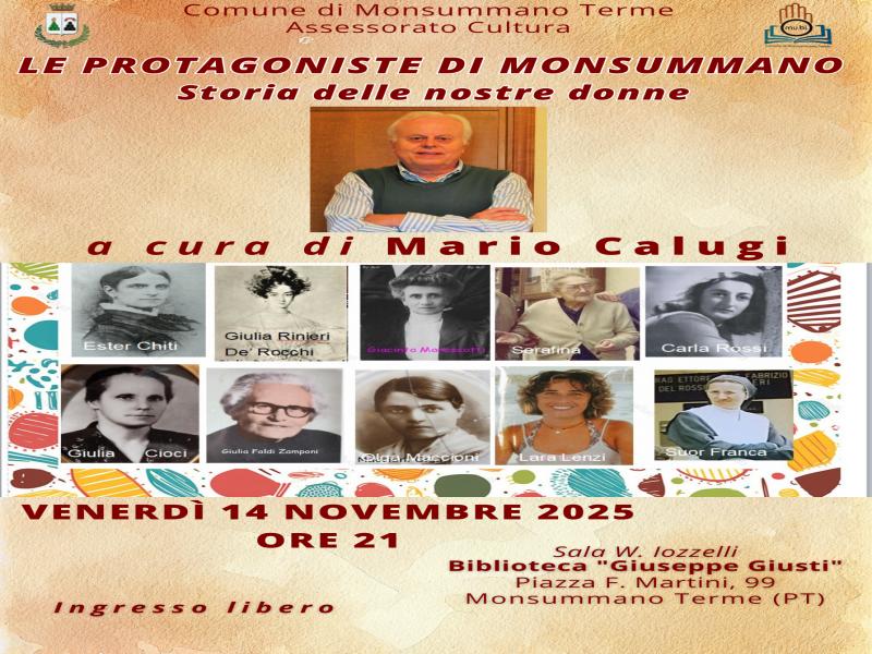 L'Assessorato alla Cultura di Monsummano Terme presenta la conferenza dal titolo “LE PROTAGONISTE DI MONSUMMANO. Storia delle nostre donne”, a cura di Mario Calugi, che si terrà venerdì 14 novembre 2025, alle ore 21, nella Sala Iozzelli della Biblioteca “Giuseppe Giusti”.