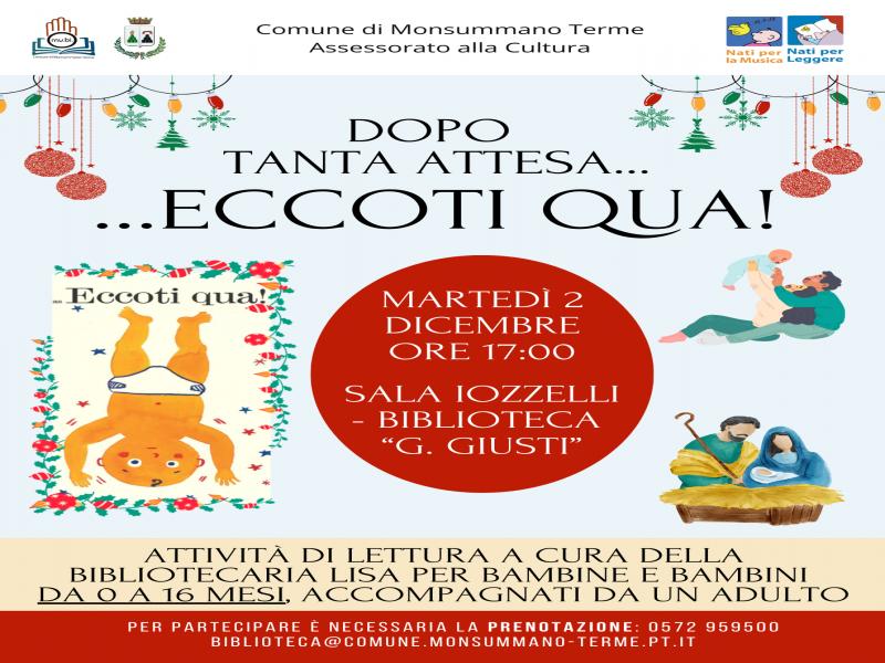 Martedì 2 dicembre 2025, alle ore 17, nella Sala Iozzelli della Biblioteca "Giuseppe Giusti" di Monsummano Terme si terranno attività di lettura dal titolo "DOPO TANTA ATTESA...ECCOTI QUA!", a cura della bibliotecaria Lisa.
