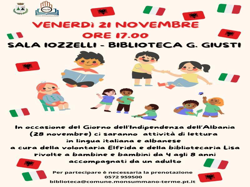 Venerdì 21 novembre 2025 alle ore 17, nella Sala W. Iozzelli della Biblioteca "Giuseppe Giusti" di Monsummano Terme si terranno attività di lettura in lingua italiana e albanese, a cura della volontaria Elfrida e della bibliotecaria Lisa, in occasione del giorno dell'indipendenza dell'Albania.