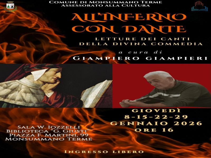 Dall'8 gennaio 2026, prosegue il ciclo di incontri dal titolo “ALL'INFERNO CON DANTE” Letture dei canti della Divina Commedia, a cura del prof. Giampiero Giampieri, che si terrà tutti i giovedì, alle ore 16, nella Sala W. Iozzelli della Biblioteca "Giuseppe Giusti".